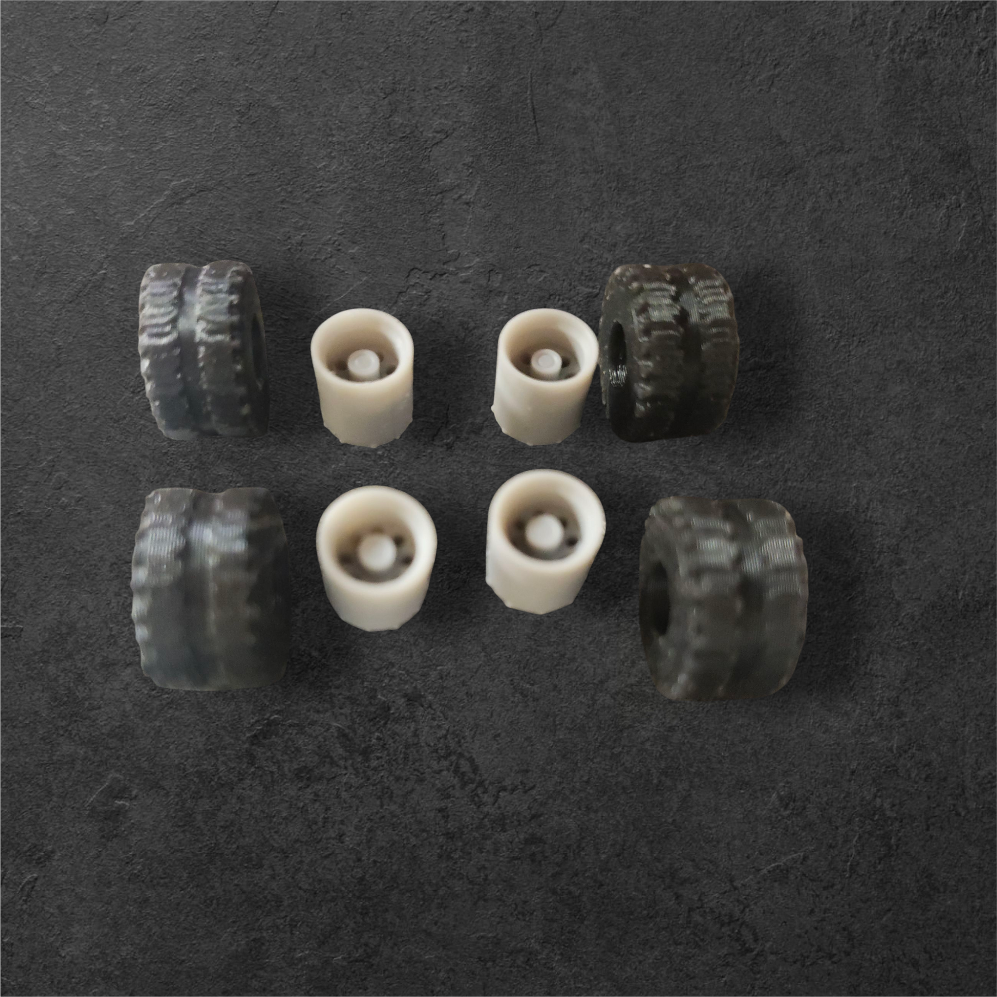 Each set includes 4 precision 3D-printed rims and 4 matching off-road style tires, sized to maintain proper clearance while filling out the wheel wells for a tougher, more realistic look. The rims are engineered for a snug, reliable fit, while the tires feature a detailed tread pattern for that classic 4x4 appearance on the track or display shelf.